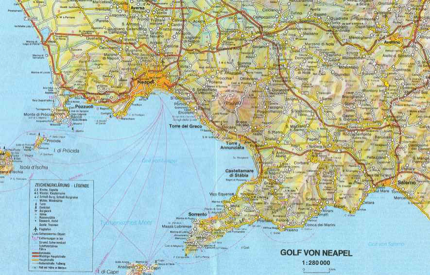 Überblick über den Golf von Neapel gibt die folgende Karte. Die Touren gehen von Vico Equense aus bis zum Capo di Miseno und im Süden über Salerno hinaus nach Paestum.